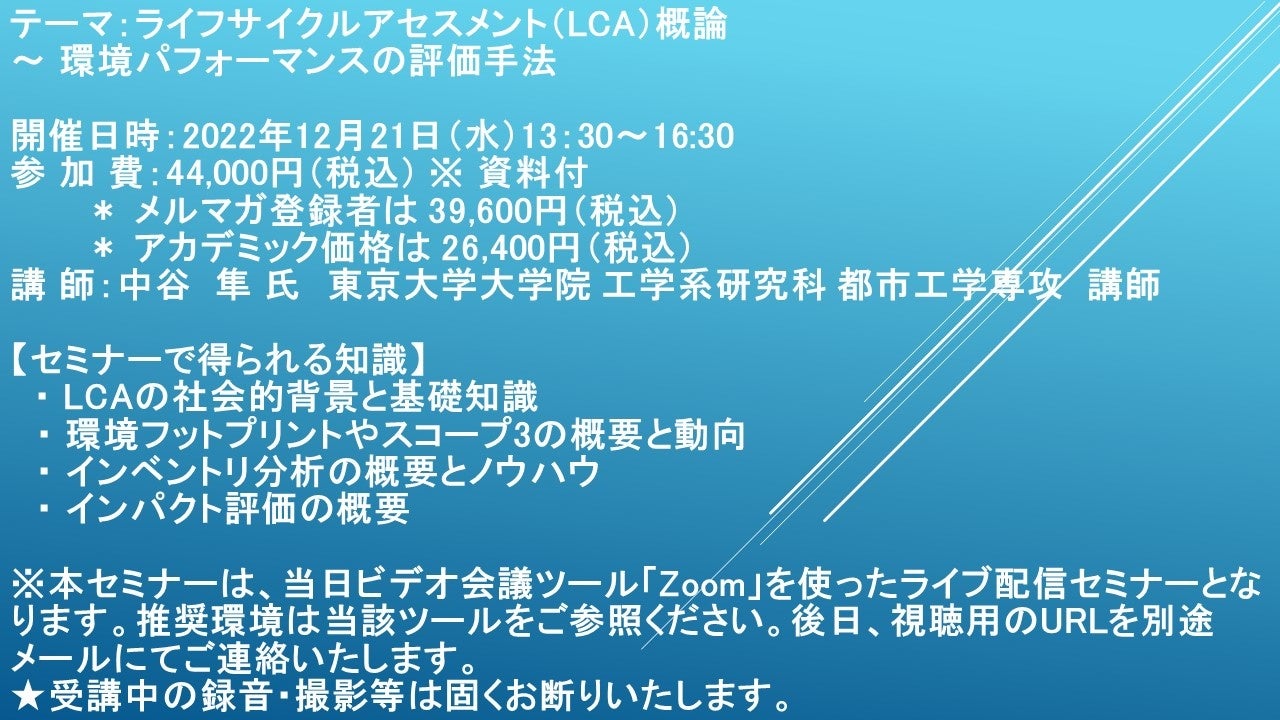 先端技術情報や市場情報を提供している(株)シーエムシー・リサーチ(千代田区神田錦町: https://cmcre.com/ )では、 各種材料・化学品などの市場動向・技術動向のセミナーや書籍発行を行っておりますが、 このたび「ライフサイクルアセスメント(LCA)概論 ~ 環境パフォーマンスの評価手法」と題するセミナーを、 講師に中谷 隼 氏 東京大学大学院 工学系研究科 都市工学専攻 講師)をお迎えし、2022年12月21日(水)13:30より、 ZOOMを利用したライブ配信で開催いたします。 受講料は、 一般:44,000円(税込)、 弊社メルマガ会員:39,600円(税込)、 アカデミック価格は26,400円(税込)となっております(資料付)。