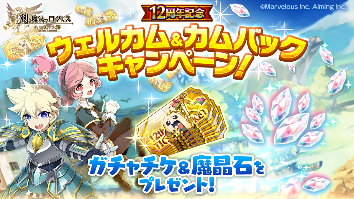 今ログレスを始めるor戻ってくると、魔晶石50個と「12周年記念ガチャチケット」100枚をプレゼント!