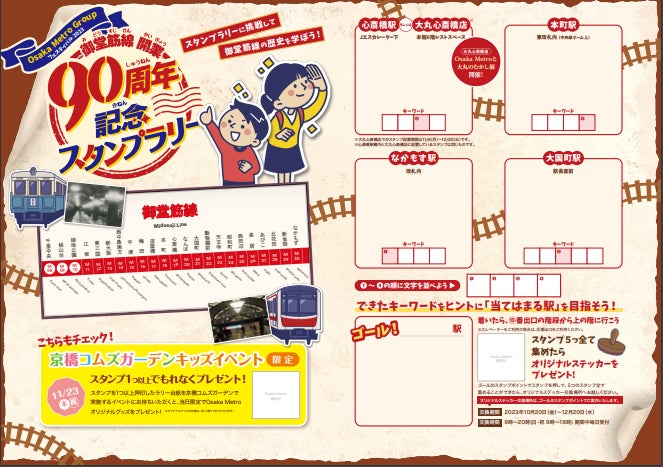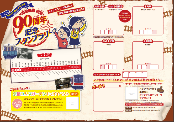 Osaka Metro主催で「御堂筋線90周年記念スタンプラリー」も開催中。御堂筋線の4駅(本町駅・心斎橋駅※・大国町駅・なかもず駅)と大丸心斎橋店館内※、そしてシークレットになっているゴール地点にスタンプ台を設置。スタンプを5つ集めると、オリジナルステッカーを進呈します。