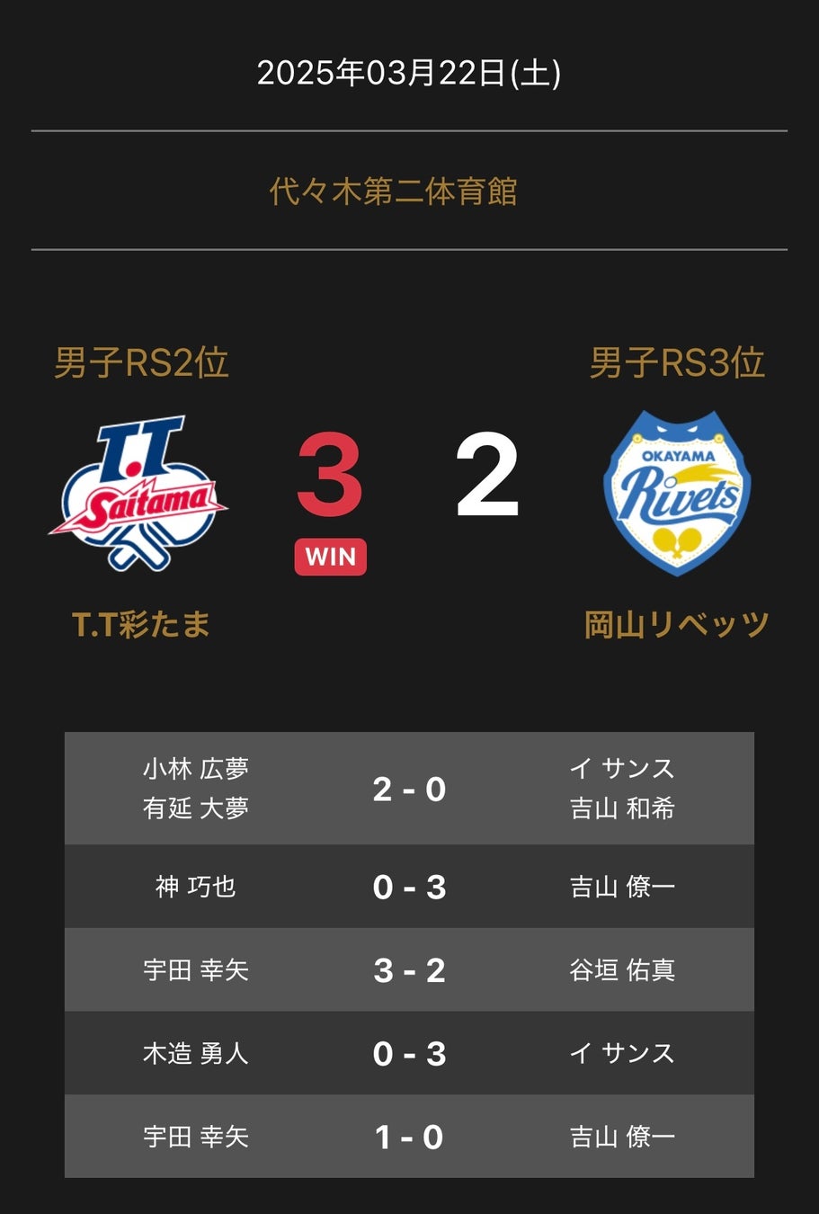 ノジマTリーグ 2024-2025シーズン 公式戦 3月22日開催 男子セミファイナル T.T彩たま vs 岡山リベッツの試合は、3-2でT.T彩たまが勝利しました。