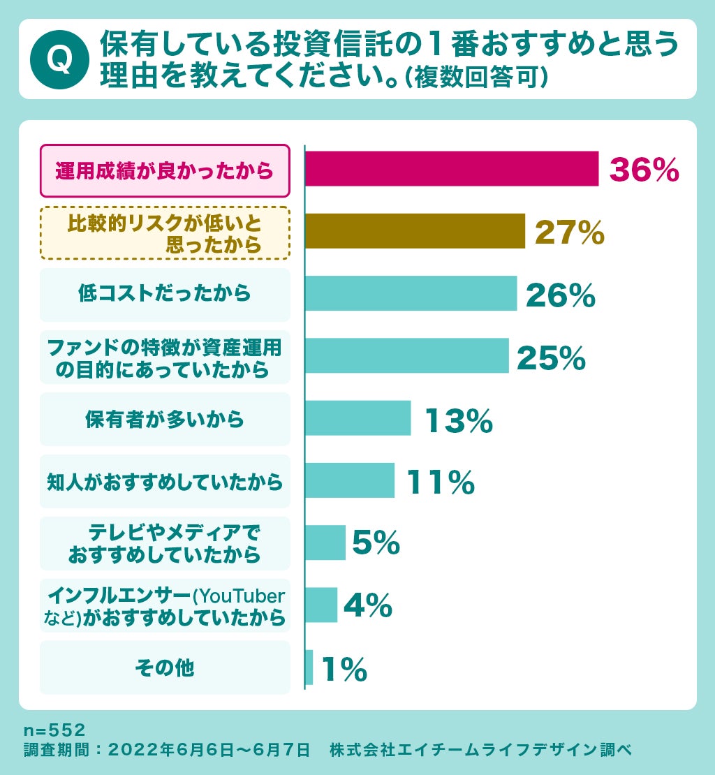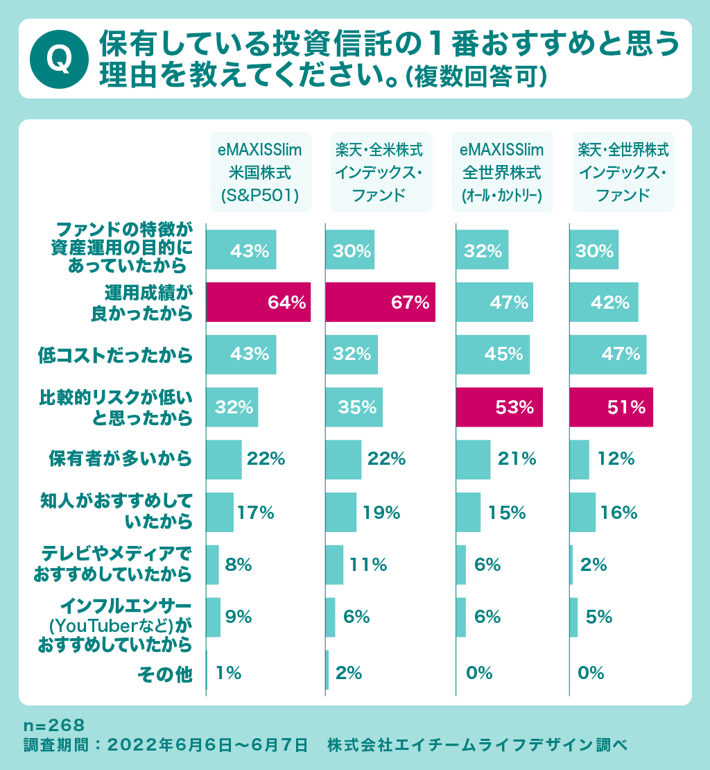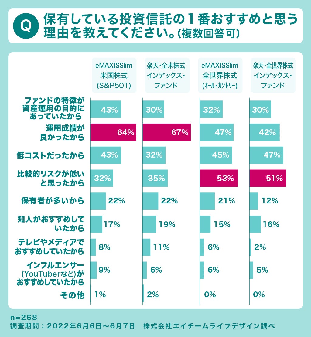 選んだ理由の第1位は、「運用成績が良かったから」で、これは、2022年5月中旬に米国株式市場が下落傾向を見せるまで、ここで挙げられた商品については好調な成績を維持していたことによると考えられます。