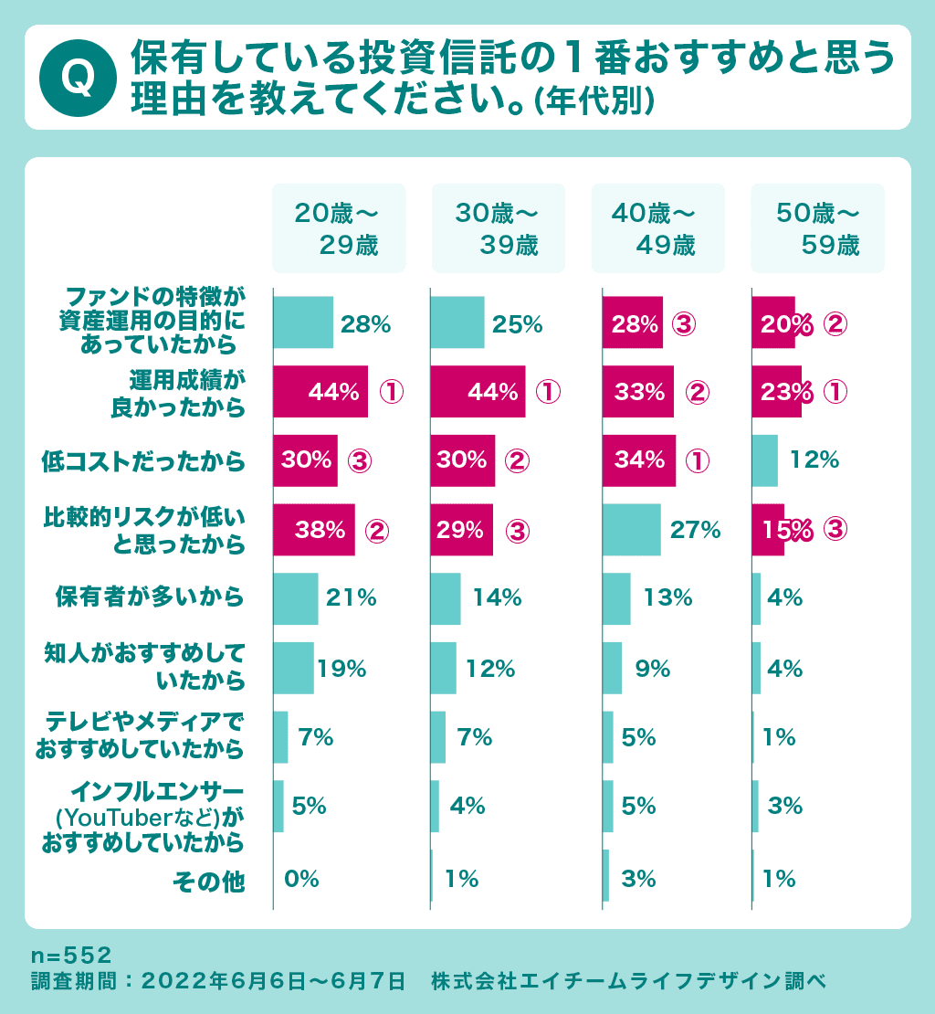 また、興味深いのは年齢が上がるにつれ、「ファンドの特徴が資産運用の目的にあっていたから」という理由が上位にあがってきている点です。年代が上がってくるほど、資産運用の目的が明確に見えてくることが要因かもしれません。