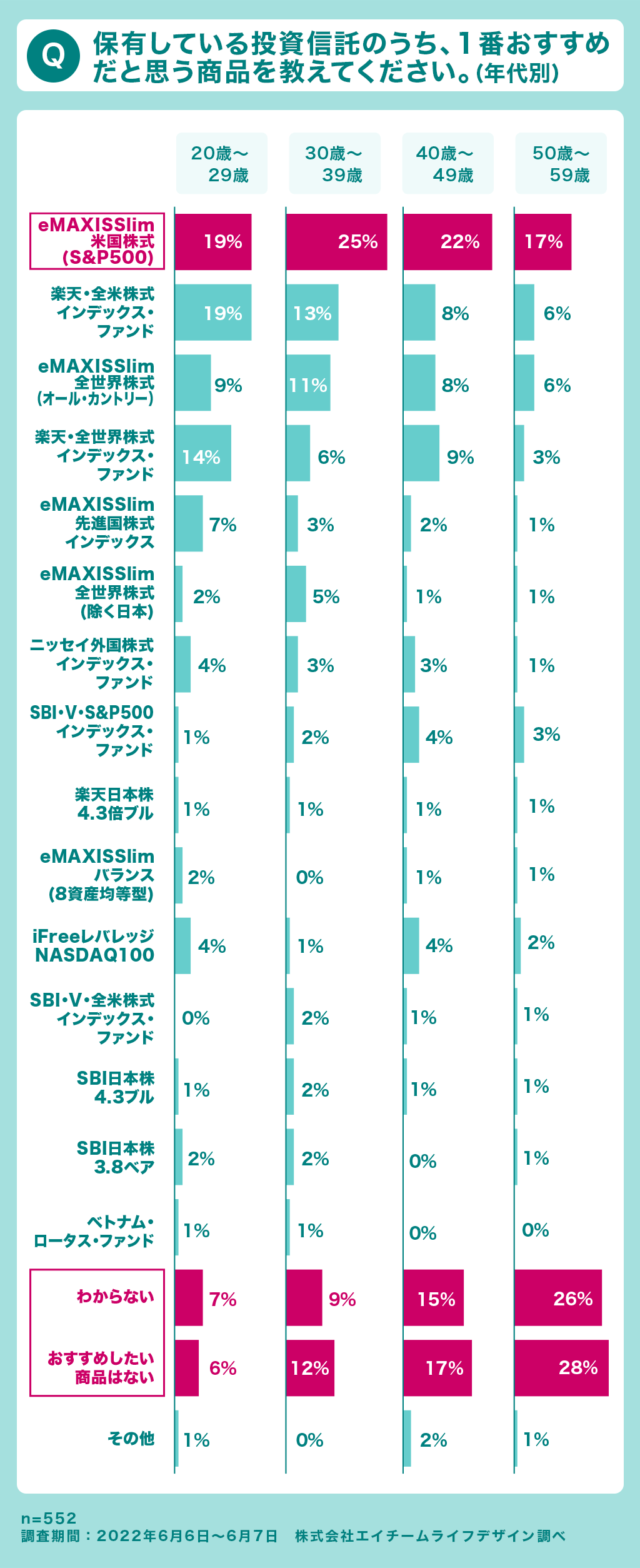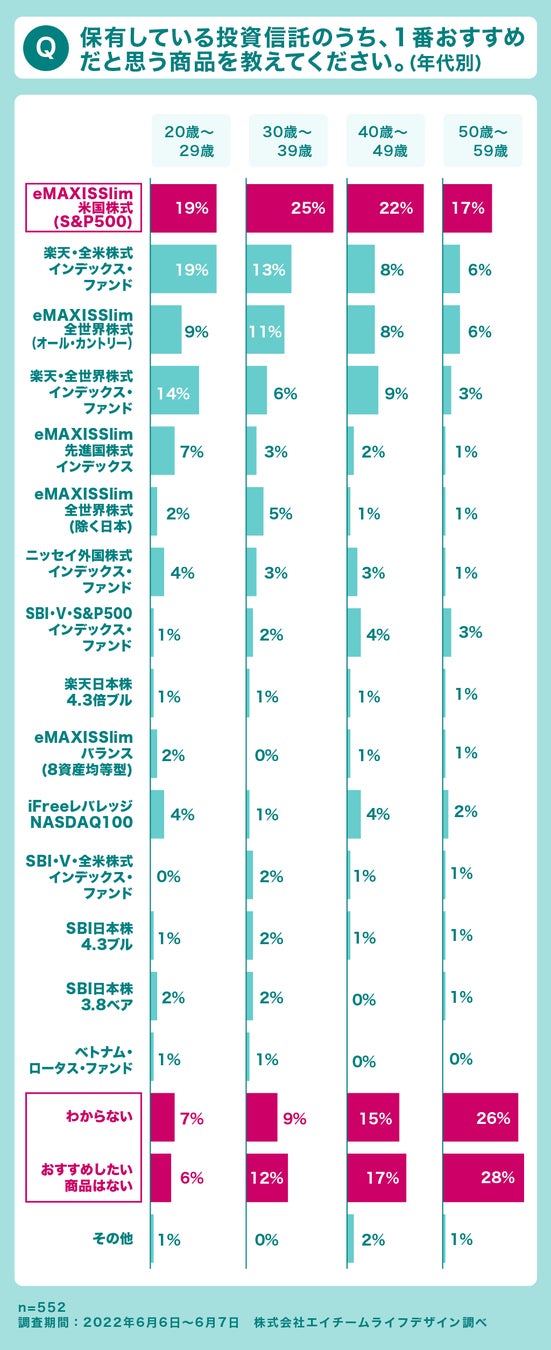 特に米国株式銘柄のインデックス・ファンドが人気 - すべての年代で「eMAXISSlim米国株式(S&P500)」が第1位! 年齢が上がるほど、「わからない」「おすすめしたい商品はない」が増える傾向に