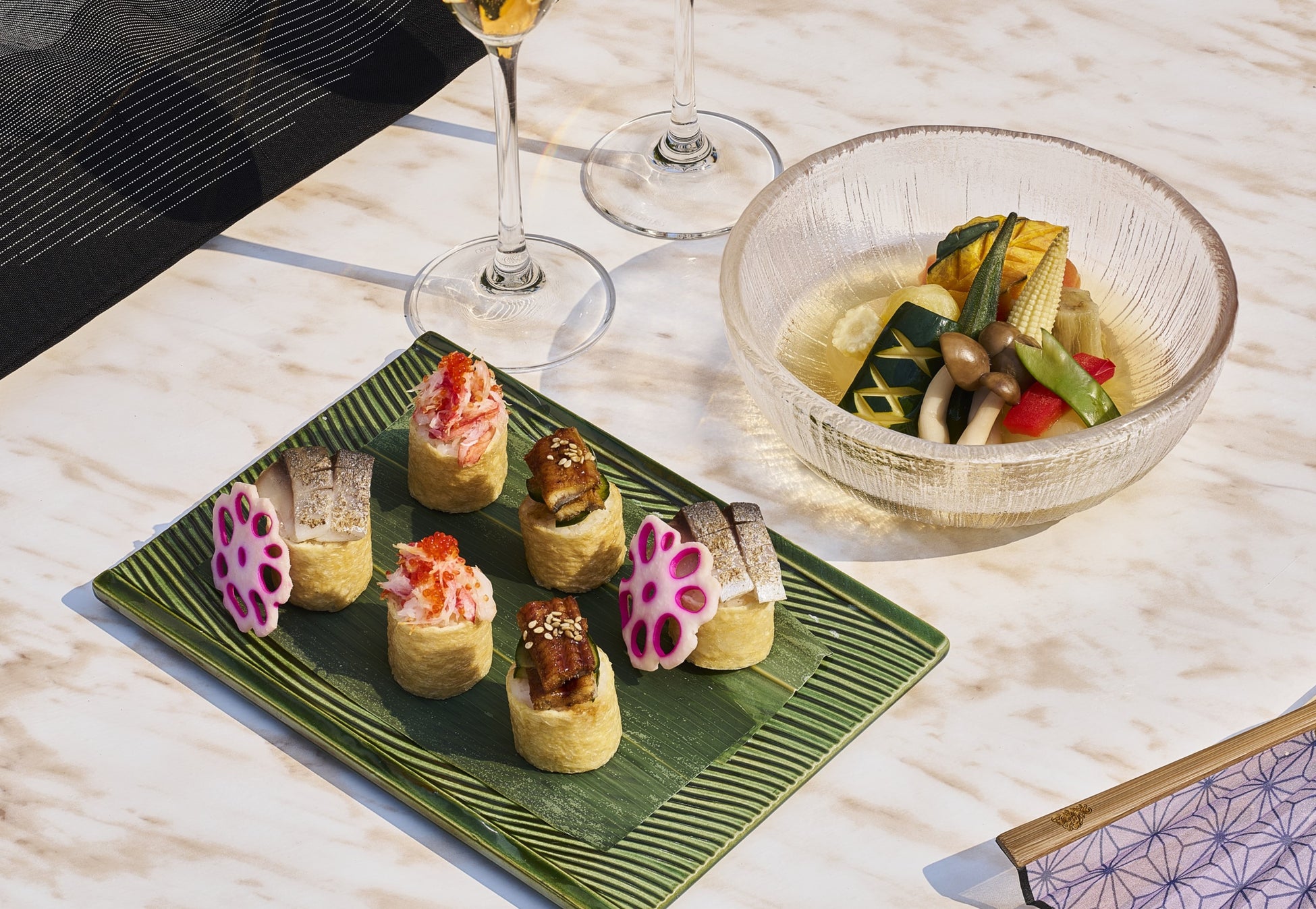 屋台メニューの定番であり、大阪のソウルフードとして人気を誇る“たこ焼き”。シャンパン&ビアガーデン - Osaka Matsuri 祭 -では、チーズを加えた濃厚なオランデーズソースにトリュフとマデラワインが芳醇に香るソースを重ねた「揚げたこ焼き」をご賞味ください。「スモークサーモントラウトのクレープ セントレジス風はしまき」では、関西地方のお祭りで定番の“はしまき”を、クレープとスモークサーモンを使ってセントレジスらしく洋風テイストで提供します。イカ焼きをチャバタと合わせて愉しむ「イカ焼きパニーニ」や、昆布とかつおの旨味を感じる優しい味わいの「夏野菜おでん」、バンズに見立てたアボカド入りのお好み焼きで旨味溢れる和牛パテを挟んだ「大阪ミニバーガー」、大阪名物“幻のソース”で味わう「串カツ盛り合わせ ヘルメスソース」、南大阪の食文化として有名な「油かす」をトッピングした「大阪名物かすうどん」、そして、鰻・蟹・鯖を美しく盛り付けた「一口稲荷寿司」まで、大阪ならではの味覚に洗練さを融合させた、セントレジスだからこそ体験できる料理の数々をお愉しみください。