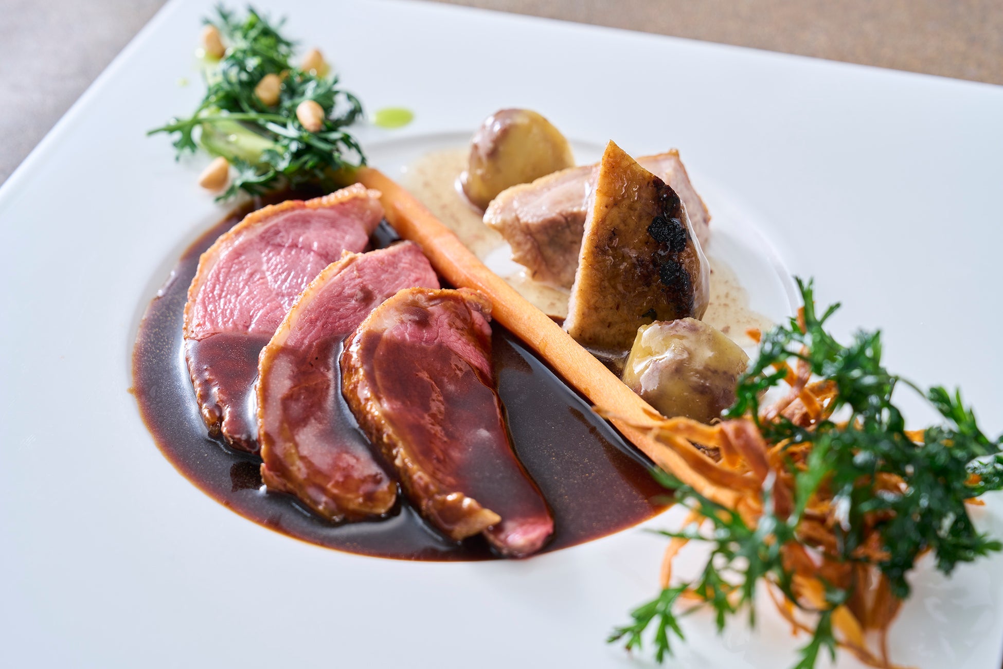 ディナーのメイン料理を飾る「~亀岡市 七谷鴨~地産地消と古典フランス料理を掛け合わせて」は、京都・亀岡市の自然豊かな七谷地域で育てられ、きめ細やかな肉質と芳醇な脂の旨みが特徴の「七谷鴨」を丁寧にローストし、皮目は香ばしく、肉はしっとりとジューシーに仕上げました。フランス料理の伝統的な“サルミソース”とかけ合わせることで、七谷鴨の深い味わいをさらに引き立てます。