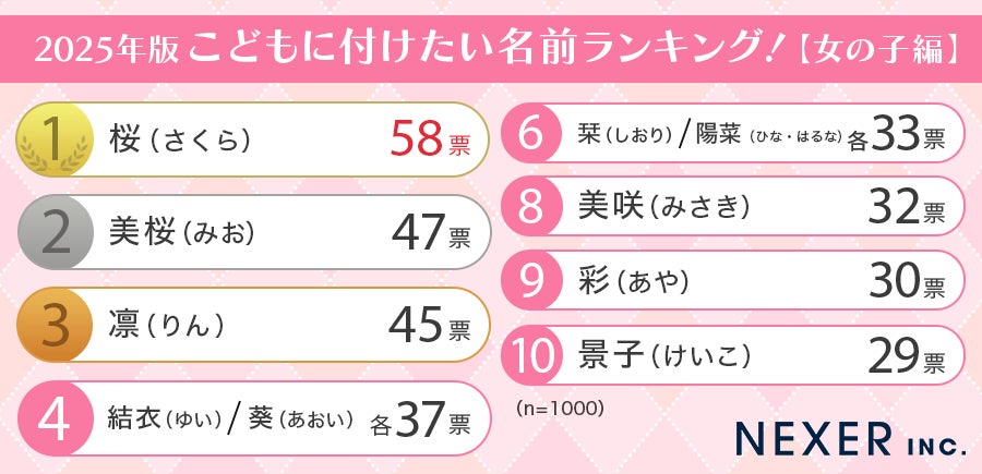2025年版女の子に付けたい名前ランキングでは、「桜」や「美桜」など自然を連想させる名前が上位を占めました。