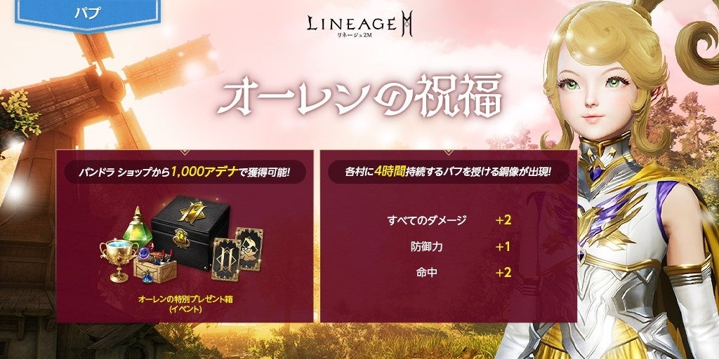 さらに、アデン大陸の各村に「オーレンの祝福の銅像(イベント)」が出現します。「オーレンの祝福の銅像(イベント)」に話しかけることで、4時間維持される、「防御力 +1」「すべてのダメージ +2」「命中 +2」のバフを受けることができます。