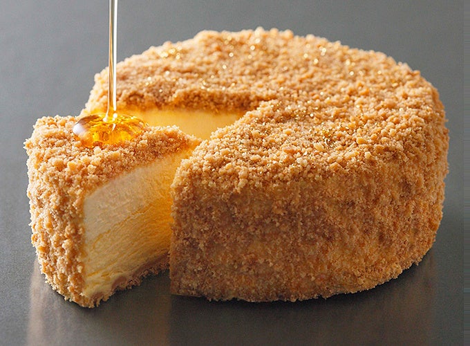 質の良いチーズの生産地と知られる、ノルマンデイー地方に似た風土の北海道根釧地区の生乳を使用。クリームチーズケーキを焼き上げたベイクドチーズケーキを1層目に。2層目には、マスカルポーネと生クリームを合わせたレアチーズを。表面にサブレを砕いたクラムをまぶして食感をプラス。贅沢な食感のコントラストを楽しめる上にさりげない金粉が華やかさを演出します。