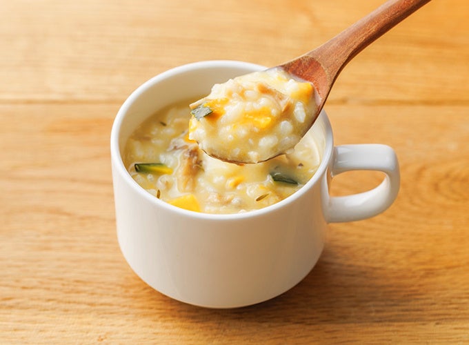 野菜と鶏肉の旨味、きのことタイムの香りが楽しめる具だくさんのおかゆです。マッシュルーム・まいたけ・かぼちゃが、チーズのコクとよく合います。柚子の風味がアクセントに!