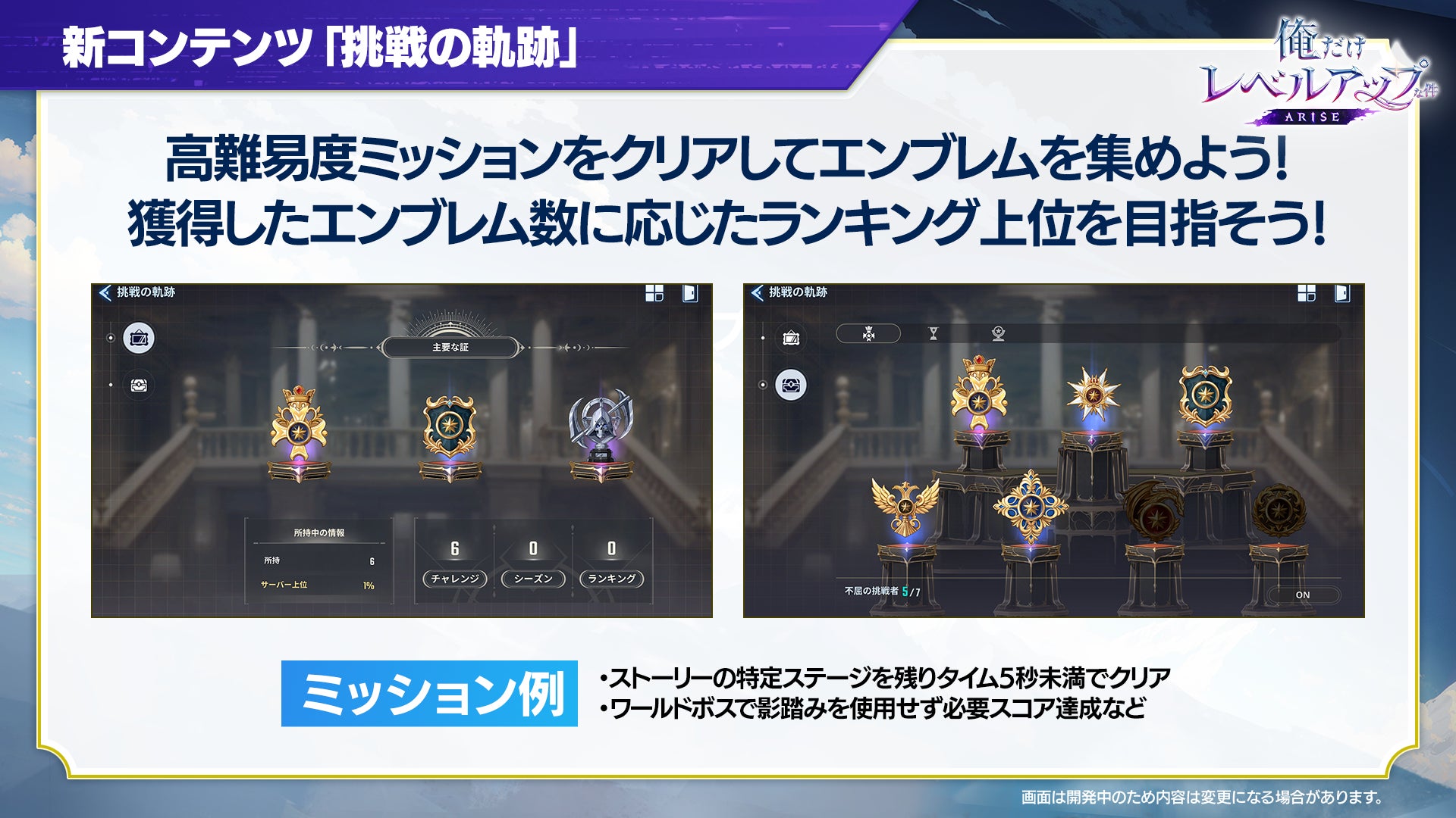 他にも、影の軍団「将軍」等級の追加やグレードアップ拡張の実施、高難易度ミッションをクリアしてエンブレムを集める新コンテンツ「挑戦の軌跡」を追加しています。