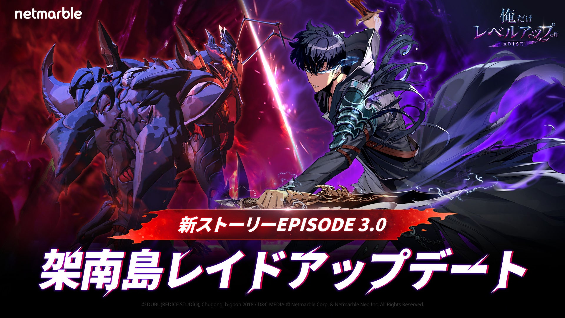 ネットマーブルは、スマートフォン及びPC向け最新アクションRPG『俺だけレベルアップな件:ARISE』(略称:俺アラ、開発:Netmarble Neo)において、本日12月19日(木)に、「架南島エピソード」や新SSRハンター、新コンテンツなどする実装する大型アップデート実施いたしました。