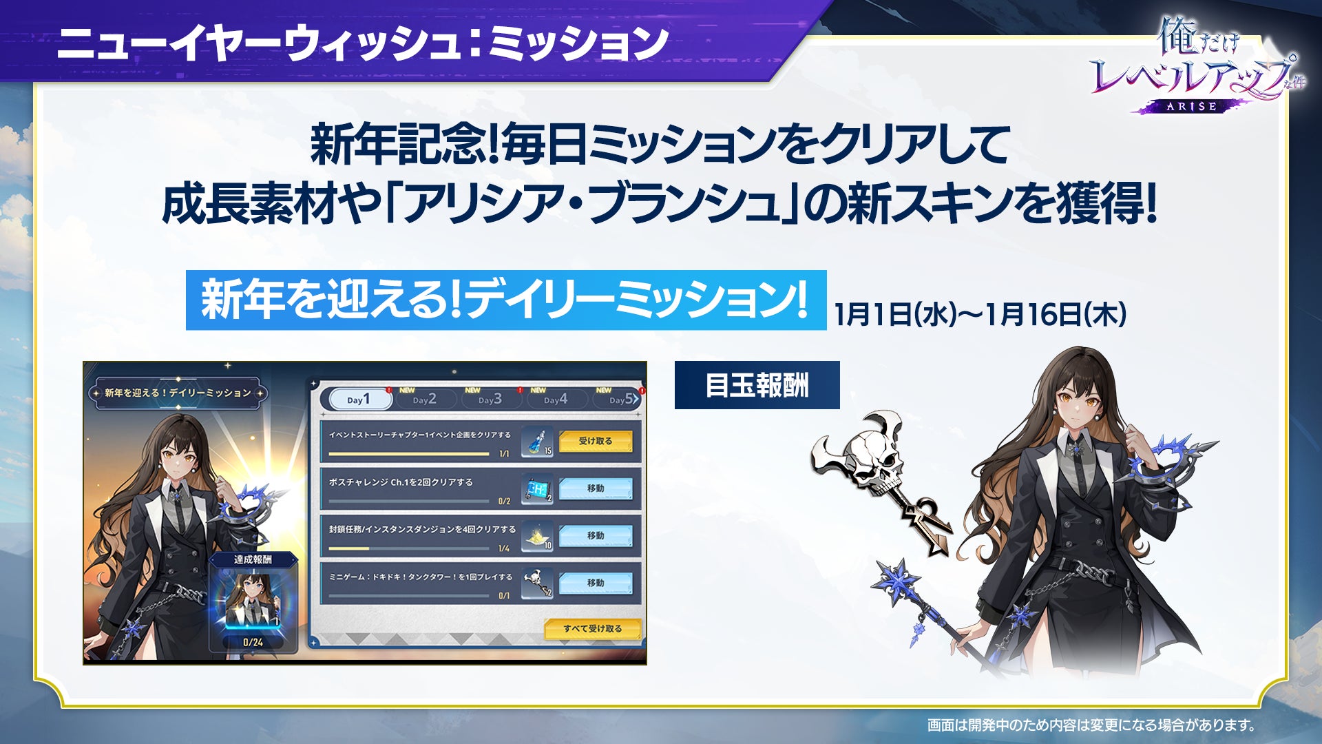 また、『俺だけレベルアップな件:ARISE』では、7日間ゲームにログインすると、新SSRイベント武器「黄金尾ノ狐」などの報酬を受け取ることができる「ホリデーパーティー:ログインボーナス(12月19日(木)~1月1日(水))」やゲーム内ミッションをクリアする成長素材や「アリシア・ブランシュ」も新スキンなどを獲得できる「ニューイヤーウィッシュ:ミッション(1月1日(水)~1月16日(木))」など、豪華イベントを多数開催いたします。