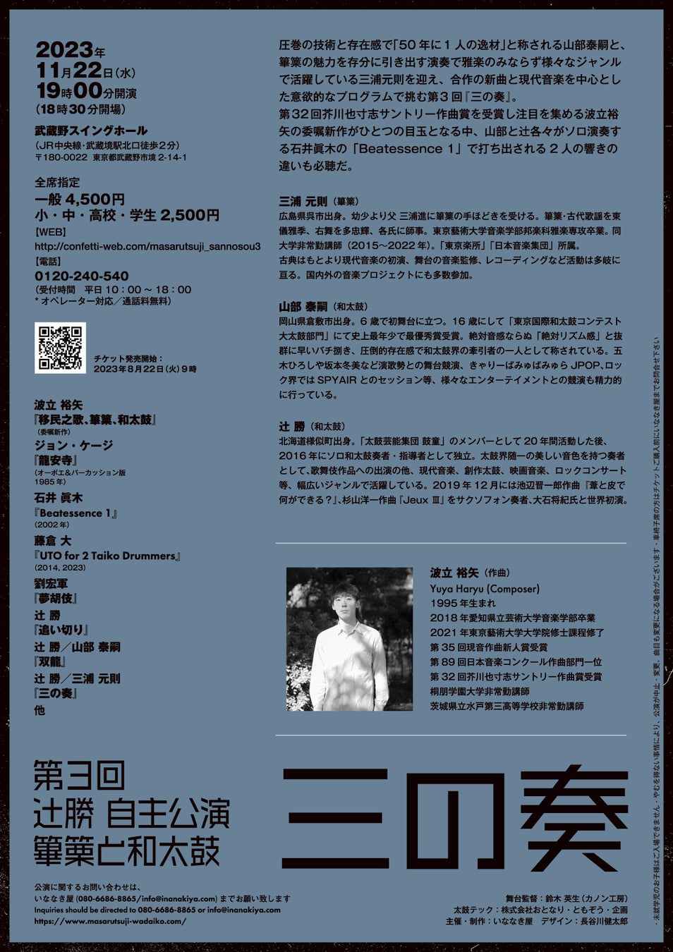 圧巻の技術と存在感で「50年に1人の逸材」と称される山部泰嗣と、篳篥の魅力を存分に引き出す演奏で雅楽のみならず様々なジャンルで活躍している三浦元則を迎え、合作の新曲と現代音楽を中心とした意欲的なプログラムで挑む第3回『三の奏』。第32回芥川也寸志サントリー作曲賞を受賞し注目を集める波立裕矢の委嘱新作がひとつの目玉となる中、山部と辻各々がソロ演奏する石井眞木の「Beatessence 1」で打ち出される2人の響きの違いも必聴です。