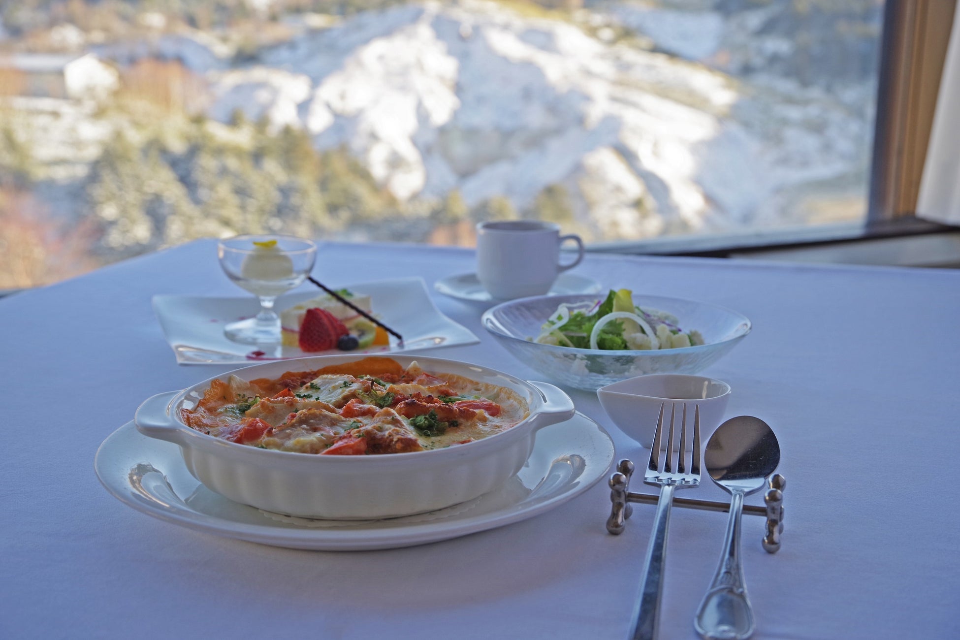 7日前までのご予約で宿泊とスノーシュー、スノーシュー後のランチがセットになった「ホッとスノーシューハイキングプラン」では雪山と白いお料理のマリアージュをコンセプトにメインディッシュには地元群馬県の「ひもかわうどん」と「赤城鳥」をラザニア風に仕上げました。料理長こだわりの温かな一皿に心も体もHOT満たしていただけます。
