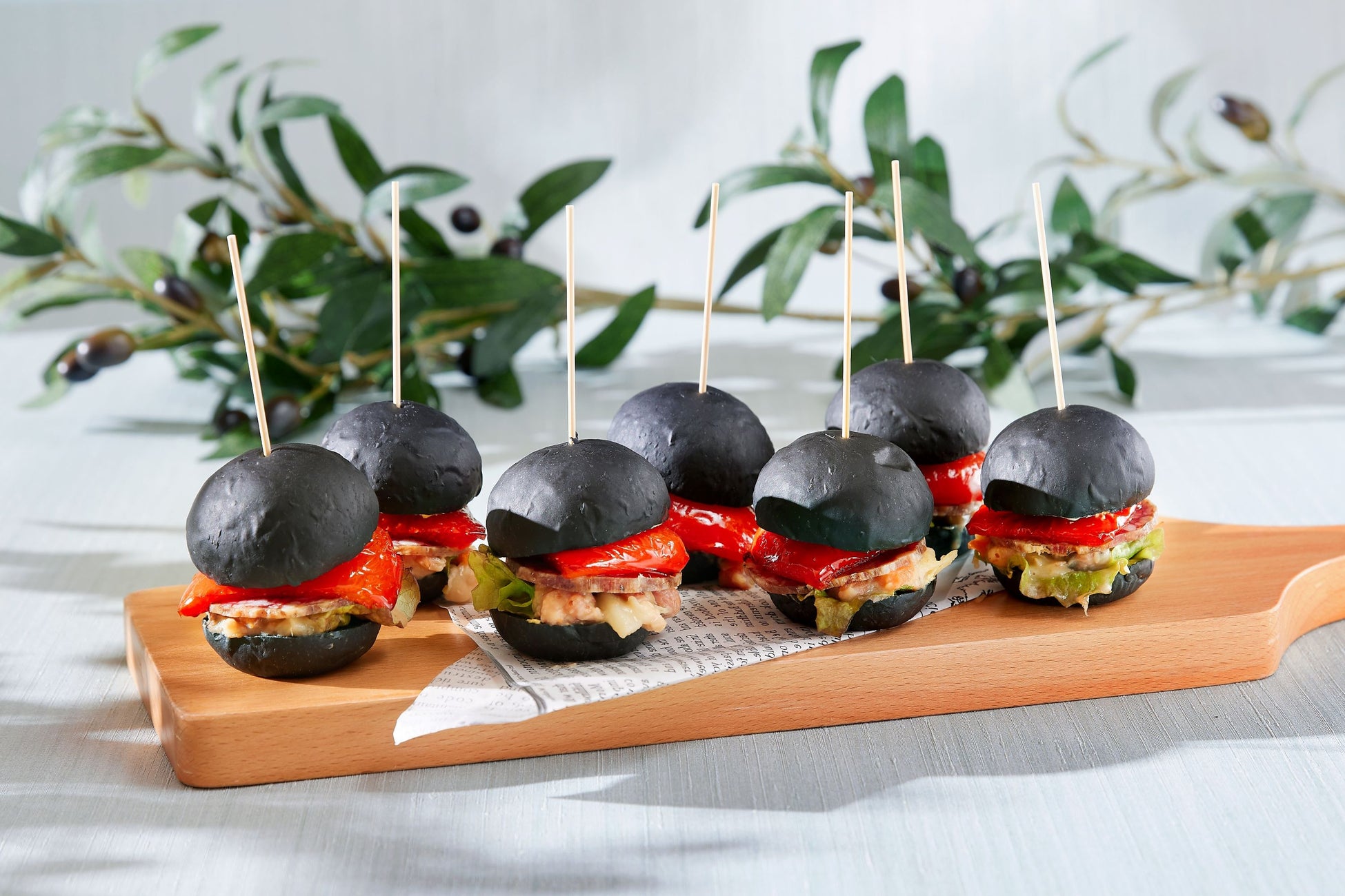 竹炭のバンズにビーフパティ、チョリソーサラミスライスと素揚げにした赤パプリカが香ばしいミニバーガー。隣には定番のミニコートヤードバーガーも。