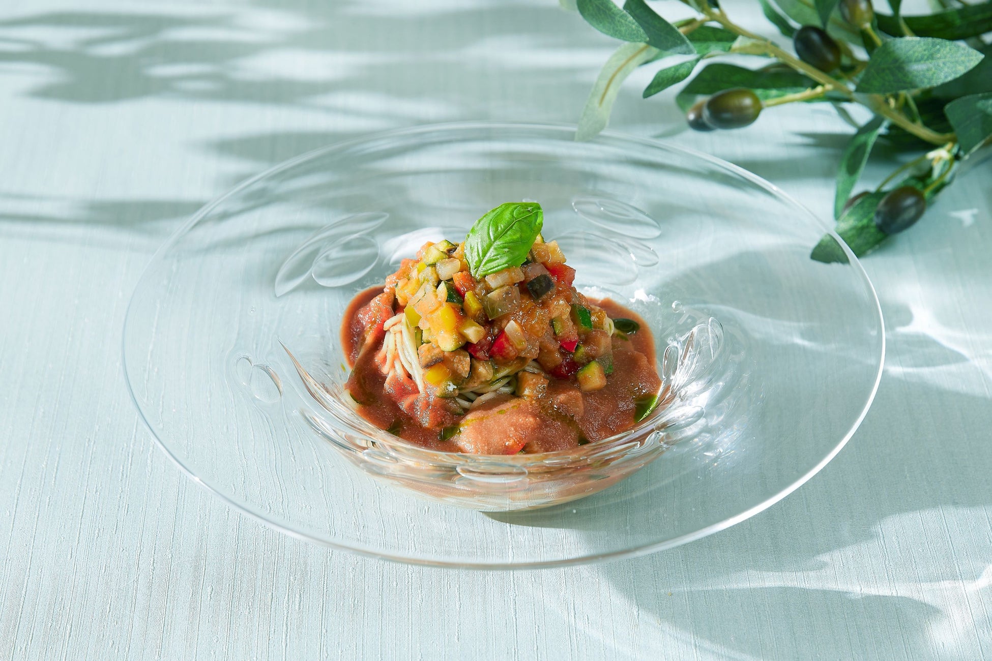 トマトを中心に赤パプリカやキュウリ、玉ねぎなどの野菜をたっぷり使った冷製のスープ。細いパスタと絡めて食べる爽やかな一皿。