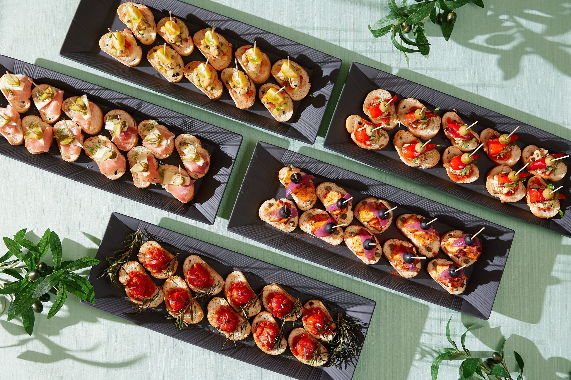 生ハム・マンチェゴチーズのピンチョス、ムール貝・刻み野菜のピンチョス、タコのガリシア風ピンチョスなど、色鮮やかな一口サイズのピンチョス。
