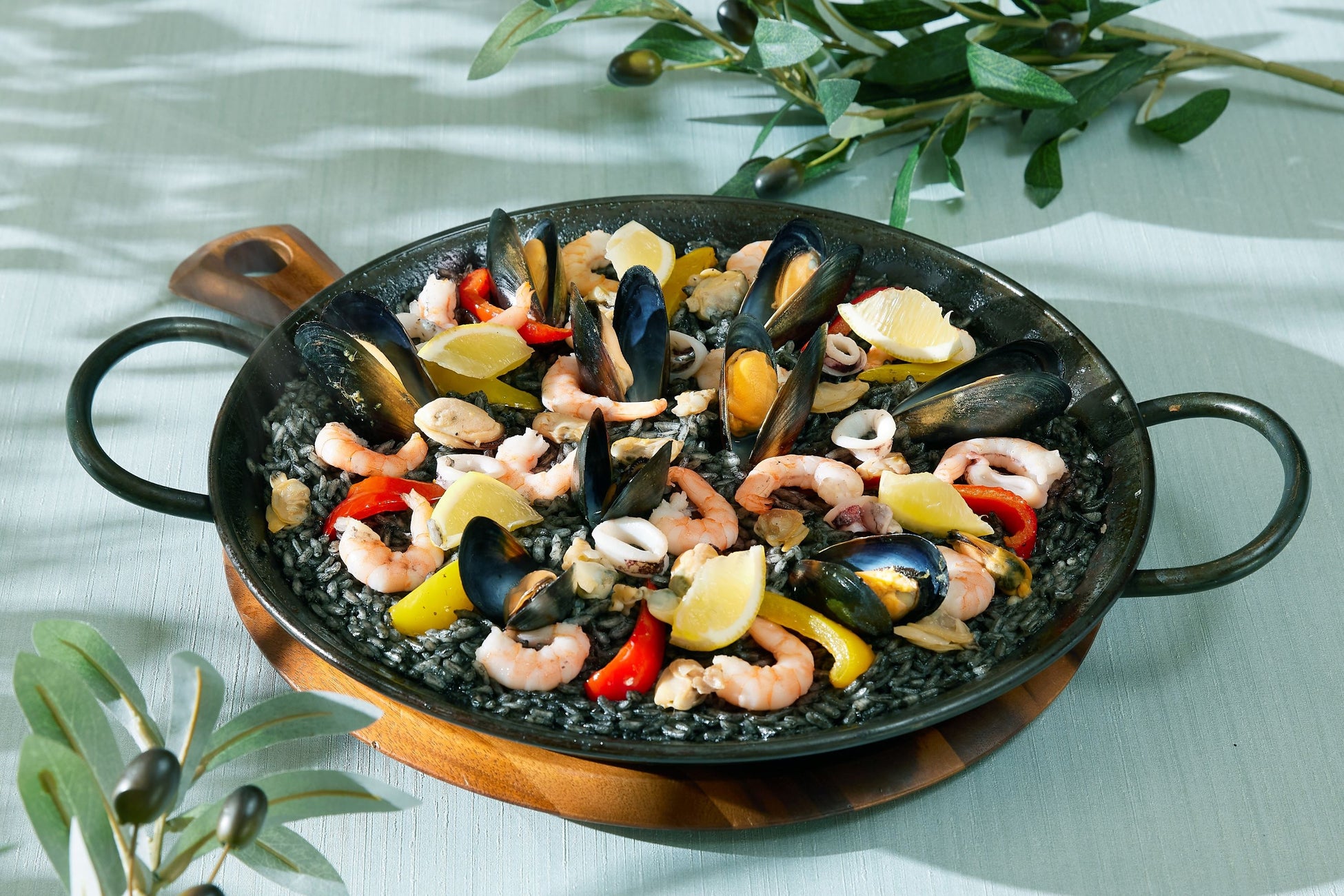 直径45cmのパエリア皿でつくる新鮮な魚介類が豊富にのったイカ墨のパエリア。スペイン郷土料理の定番。