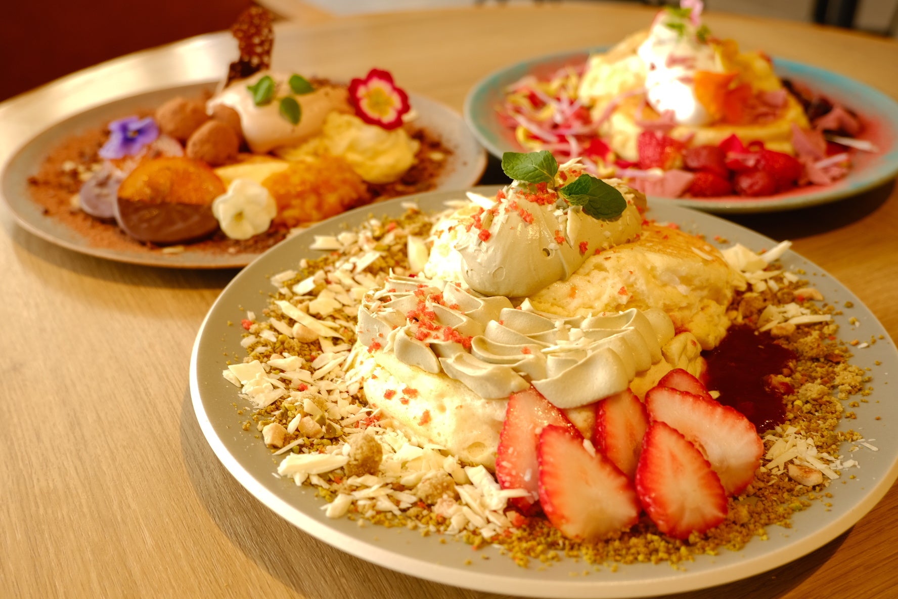 また、フレッシュストロベリーやベリーコンポートが人気の看板メニュー”Fresh-Red”にはルビーチョコレートをトッピング。3種類のパンケーキ×チョコレートの組み合わせからぜひ、お好みの一皿を見つけてください。