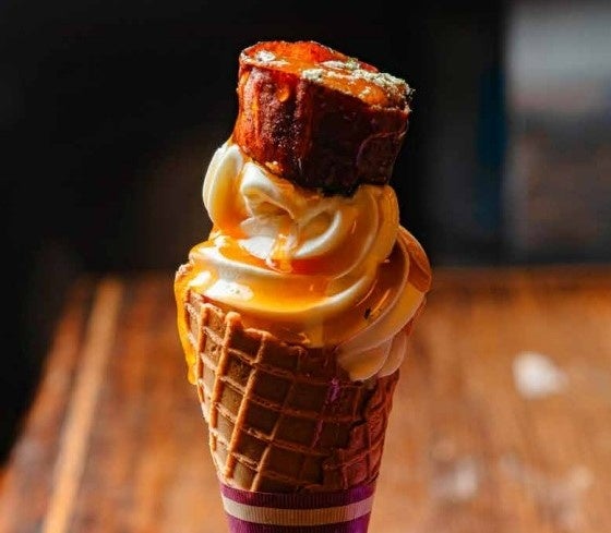 やきいもソフト×大学芋の想像を超えたベストマッチ!おいものやさしい甘さとバニラの香り、焼き芋のほのかな香ばしさを感じるソフトクリーム。秘伝の燻製タレにのり塩を効かせた大学芋と一緒に食べれば、さらに新感覚な味わいが!