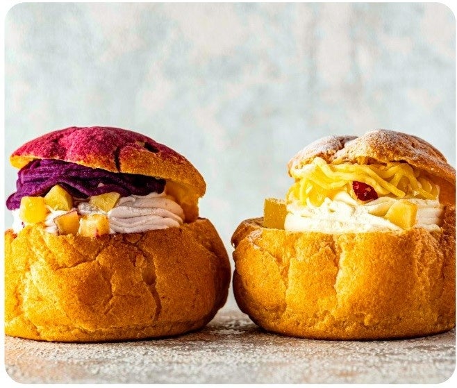 新しい“お芋和洋菓子”を提案する福井県のお店が初登場!シュー生地に濃厚カスタードを敷き詰め、甘み豊かなサツマイモクリームとダイスをトッピング。さらに、なめらかなスイートポテトをモンブラン風に絞り、様ざまな食感と甘さを楽しめる一品に。