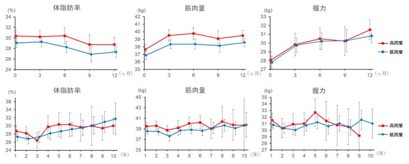 治療開始1年までに筋肉量の大きな増加を認めましたが、以降も緩やかな増加を認めました。