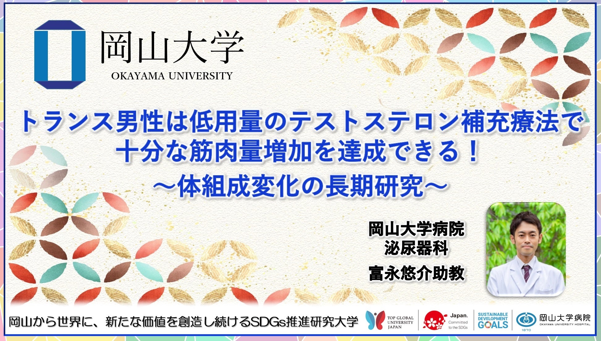 岡山大学病院は全国有数のジェンダーセンターを設置し、岡山県内外から多くのトランスジェンダーの方が来院されて診断や治療を受けています。今回の体組成の研究により、ガイドラインが整備されて多くのトランスジェンダーの方が安心して治療を受けることができるようになることを期待しています。