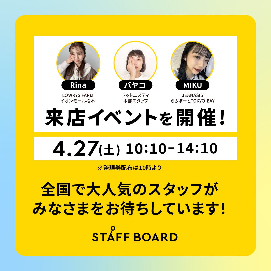 2024年4月27日(土)全国4,000名を超えるスタッフが日々のライフスタイルを発信するドットエスティ内のコンテンツ『STAFFBOARD』で人気スタッフ3名が、日本各地から「ドットエスティ」イオンモール鳥取北店に集結し、お客様へ直接お買い物のお手伝いをします。また、前日の2024年4月26日(金)21時より、「ドットエスティ」イオンモール鳥取北店からドットエスティLIVEを配信予定です。