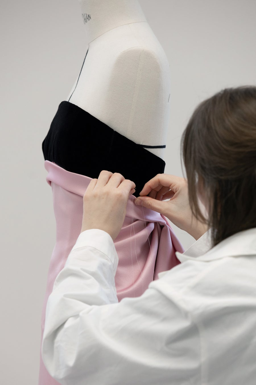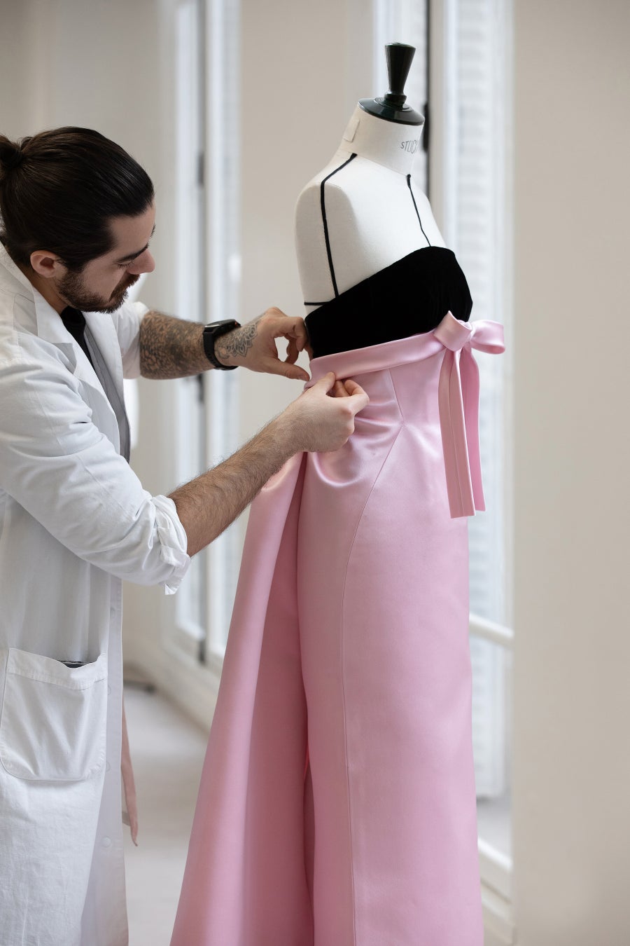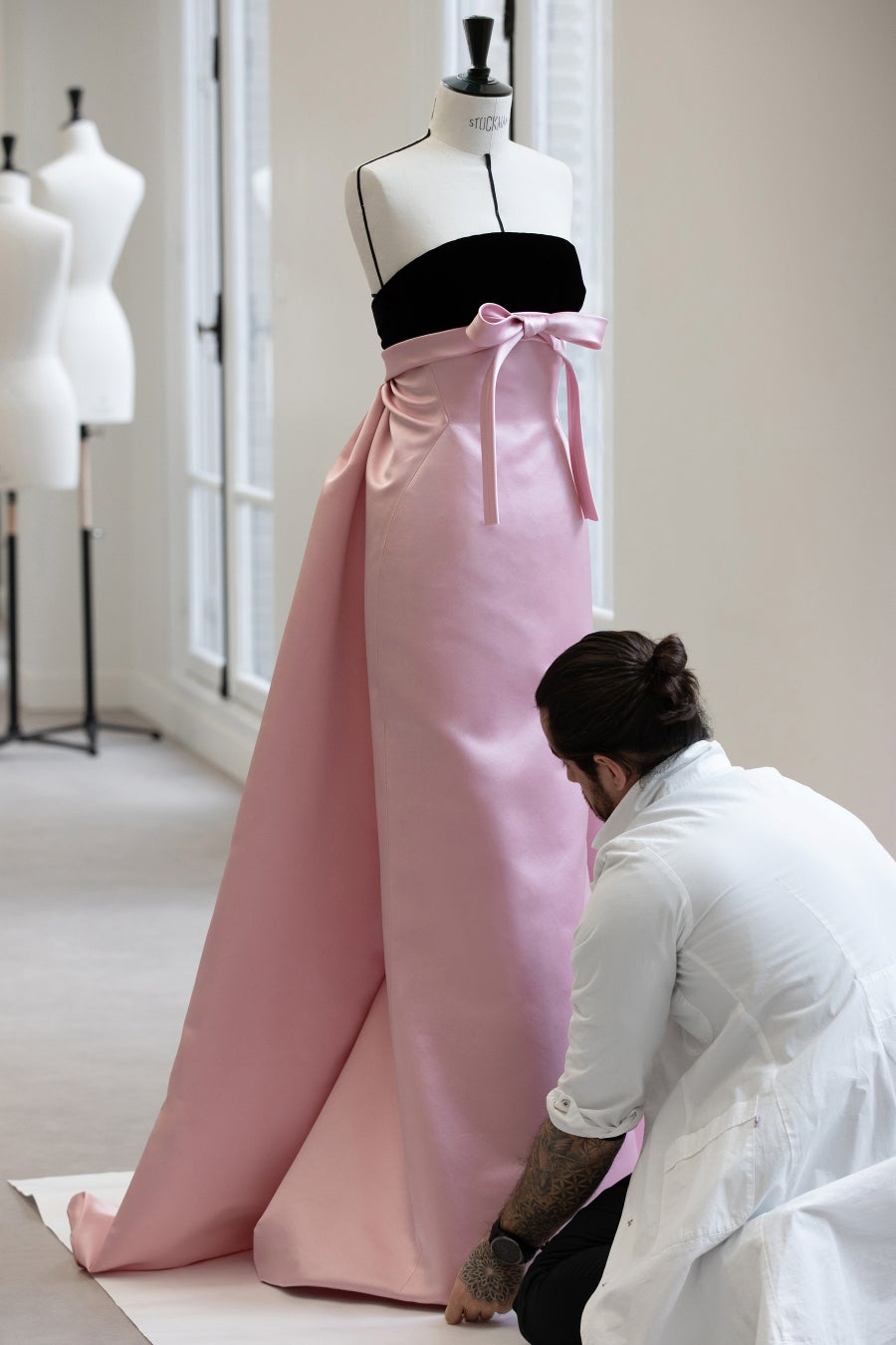 映画『ANORA アノーラ*』で主演女優賞を受賞したマイキー・マディソンは、創設者クリスチャン・ディオールがデザインした”バル デ パリ”を忠実に再現したオートクチュールドレスを纏いました。1956年春夏 コレクションで発表されたこのアイコニックなアーカイブモデルは、当初ホワイトのオーガンジーサテンとブラックのベルベットで構想されたものですが、ピンクのダブルフェイスシルクサテンのバージョンで再解釈され、ブラックのベルベットビスチェに繊細なリボンが飾られています。ディオール クチュール アトリエとマリア・グラツィア・キウリによってカスタムメイドで再現されました。この卓越したドレスは、製作に400時間以上をかけて完成に導かれます。夢の魔法を永続させるディオールアトリエのエクセレンスを体現したサヴォワールフェールの詳細をソフィ・カルによる撮り下ろし写真からご覧ください。