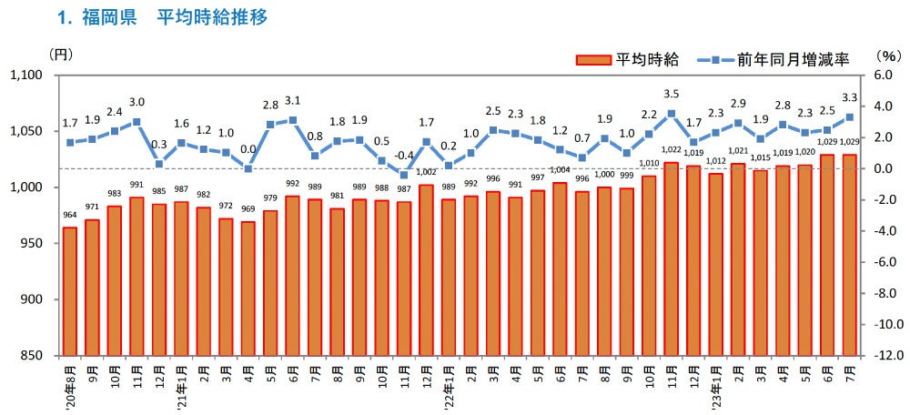 ■福岡県の平均時給は1,029円(前年同月996円、前月1,029円)