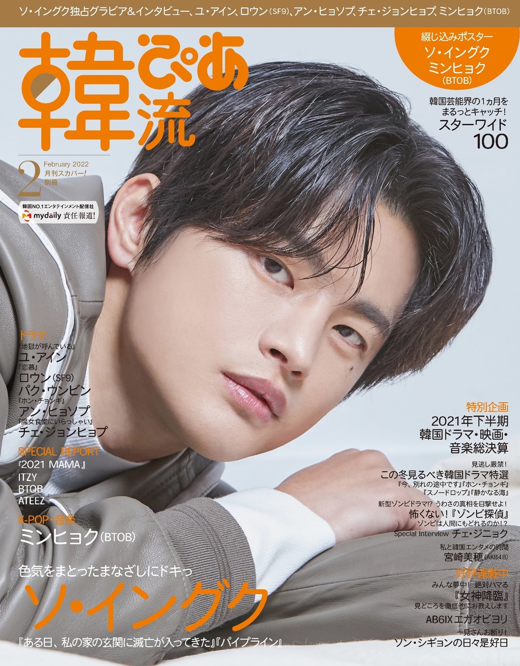 2022年2月号は、3年ぶりに人気俳優ソ・イングクが表紙に登場。2009年音楽オーディション番組で優勝し歌手としてデビュー後、2012年に俳優としての活動をスタートして以来、青春ラブストーリー、時代劇、ラブコメディ、ミステリーと幅広いジャンルの役柄を演じ、演技力が高く評価されています。昨年は映画『パイプライン』(ユ・ハ監督)で盗油団のリーダーに扮し、3年ぶりのドラマとなった『ある日、私の家の玄関に滅亡が入ってきた』では、人ではない“滅亡”という抽象的なキャラクターを巧みに表現しました。巻頭では、この最新2作について独占を含むインタビューを、撮りおろしグラビアと共にお届け。