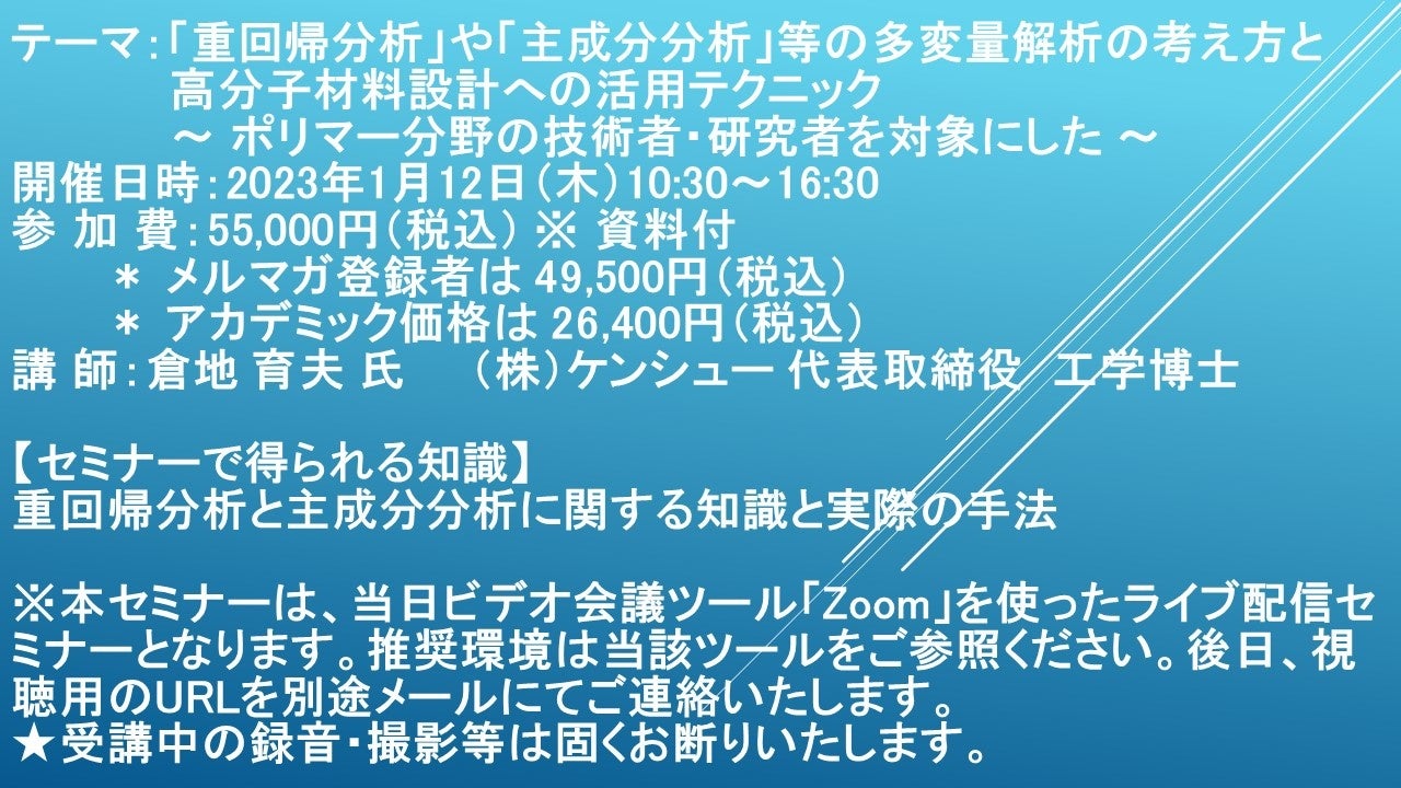 先端技術情報や市場情報を提供している(株)シーエムシー・リサーチ(千代田区神田錦町: https://cmcre.com/ )では、 各種材料・化学品などの市場動向・技術動向のセミナーや書籍発行を行っておりますが、 このたび「「重回帰分析」や「主成分分析」等の多変量解析の考え方と高分子材料設計への活用テクニック」と題するセミナーを、 講師に倉地 育夫 氏 (株)ケンシュー 代表取締役 工学博士)をお迎えし、2023年1月12日(木)10:30より、 ZOOMを利用したライブ配信で開催いたします。 受講料は、 一般:55,000円(税込)、 弊社メルマガ会員:49,500円(税込)、 アカデミック価格は26,400円(税込)となっております(資料付)。