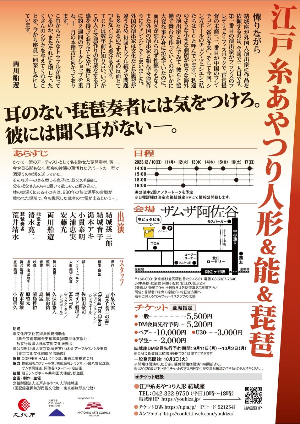 小泉八雲の「耳なし芳一の話」を、シンガポールの現代演劇を代表する演出家・チョン・ツェシエン氏が大胆に翻案し、2023年12月に上演します。結城座としては、ワン・チョン演出の「雀去冬来」以来、6年ぶりに海外演出家を招いた作品となります。