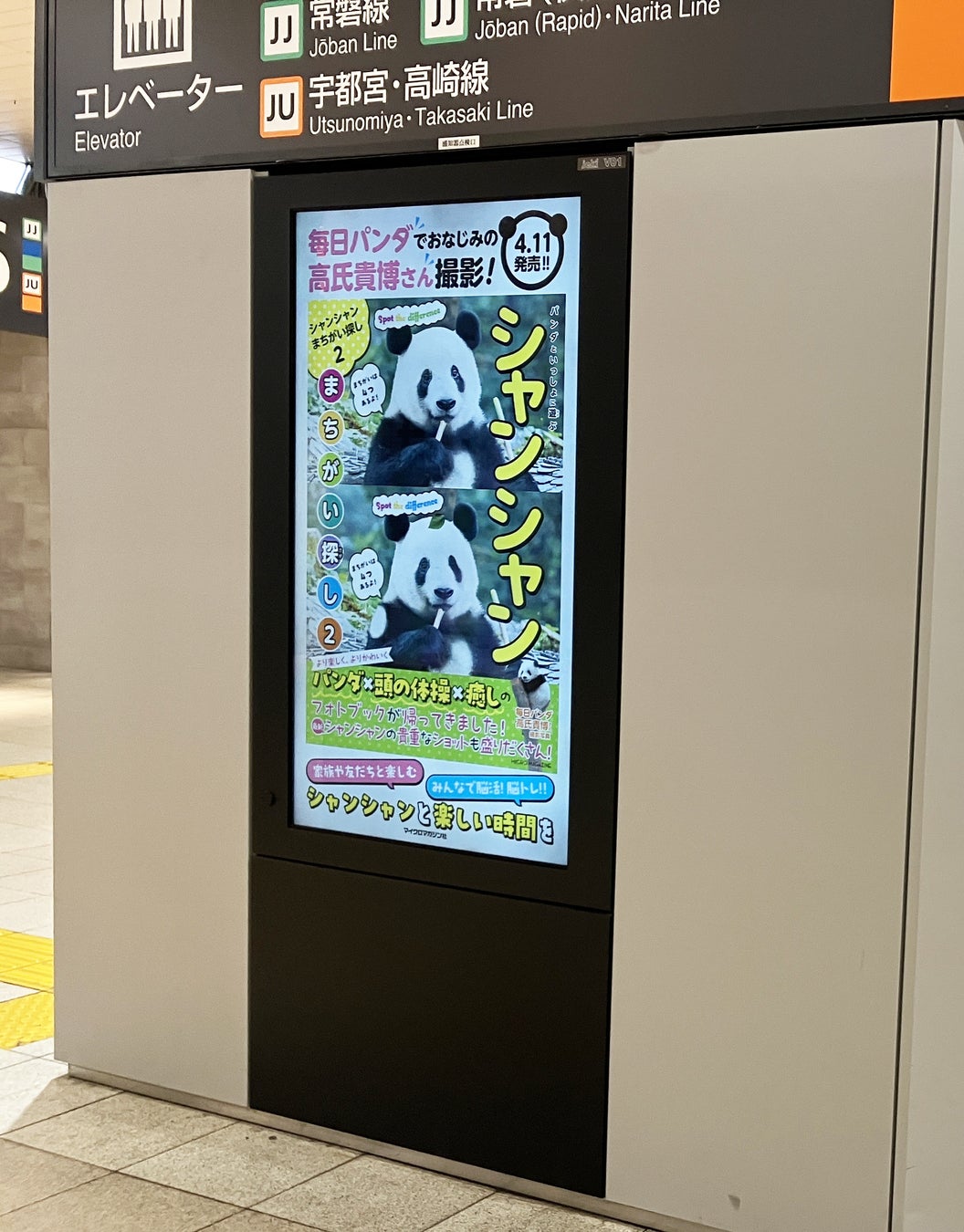 シャンシャンまちがい探し 2』の発売を記念して、4月7日(月)から「JR東日本 J・ADビジョン 上野駅公園改札内」にて、デジタルサイネージ広告を掲出いたしました。