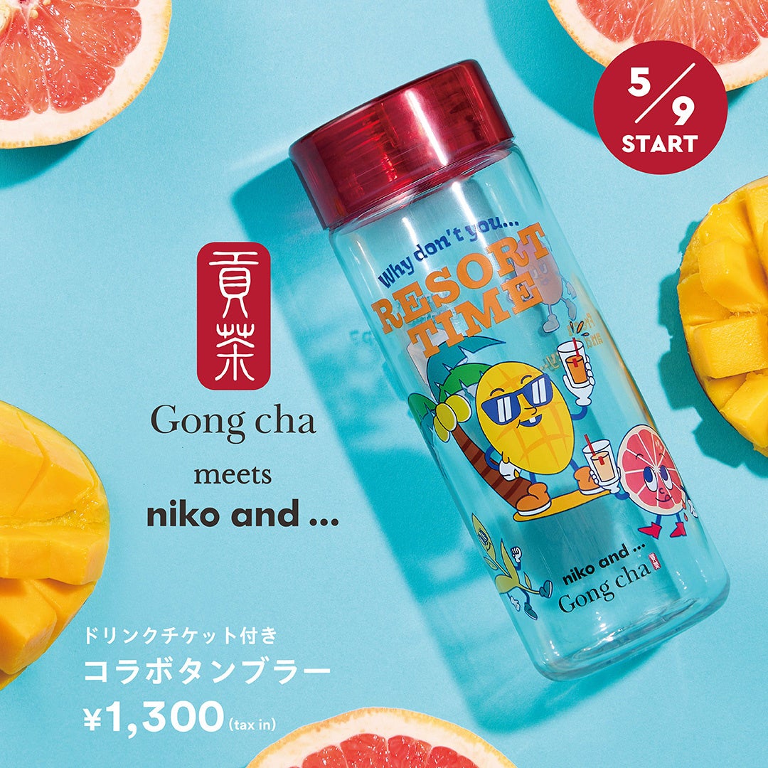 また、5月9日(木)より販売する「Gong cha ✕ niko and ... リゾートボトル」は、「Gong cha」の「ピングレマンゴー リゾート」のコンセプト『元気、チャージしに行かない?』に合わせ、「niko and ...」がデザインしました。リゾートボトルには、「Gong cha」で使用可能なドリンクチケットがついており、「Gong cha」の店舗にお持ちいただければ、お好きなティーをいつでもどこでも楽しめるマイボトルとしてもご利用いただけます。