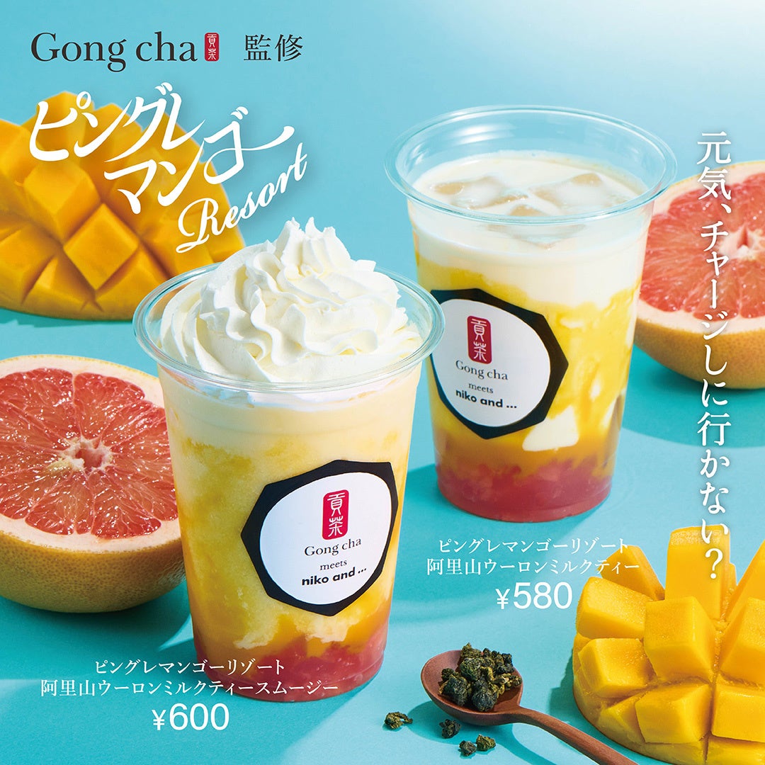 今回の限定ドリンクは、「Gong cha」の初夏の期間限定新商品「ピングレマンゴー リゾート」の発売に合わせ、「Gong cha」監修の「阿里山ウーロンティー」をベースにしたミルクティーと、そのミルクティーを「niko and ... COFFEE」で人気のスムージーにアレンジしたスペシャルテイストのドリンク2種です。