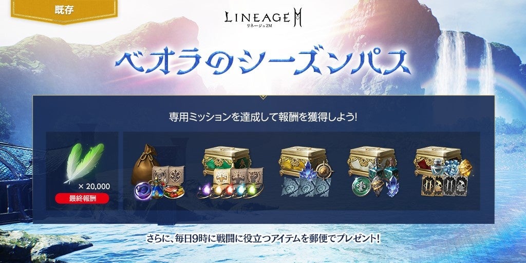 期間中、毎日達成していくデイリー ミッションと2週間でクリアを目指すシーズン ミッションで構成された、新規シーズンパス「ベオラのシーズンパス」が登場します。デイリー ミッション、シーズン ミッションをそれぞれ達成してシーズンパスEXPを獲得し、パス レベルを上昇させることで様々なアイテムを報酬として獲得することができます。また、1,000,000アデナを使用することでプレミアム報酬を有効化することができます。シーズンパスの最終報酬では、「アインハザードの祝福」20,000を獲得することができます。