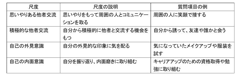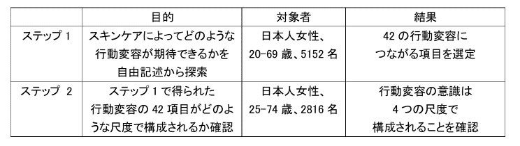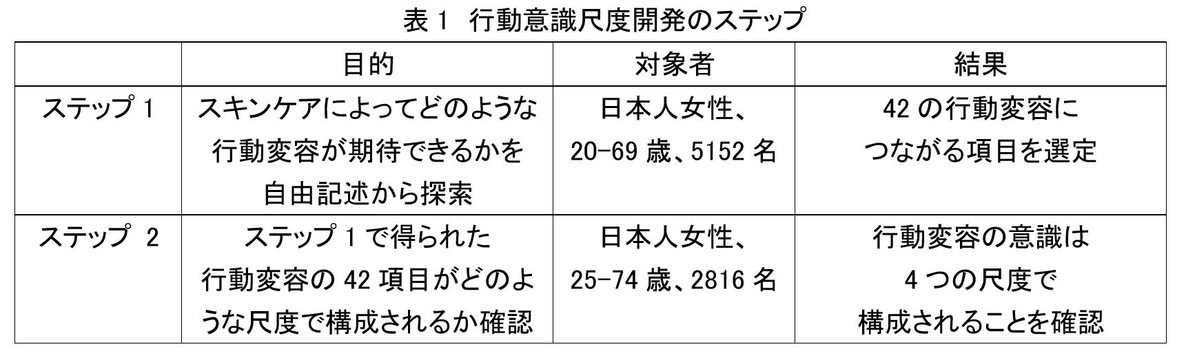自分らしい健康美の実現においては、肌などで起こる変化だけではなく、そこからもたらされる気持ちや行動の変化も踏まえることが重要です。しかしこれまで行動意識を定量的に捉える尺度がなかったことから、美容に伴う行動変容を科学的に考察・検討することが容易ではありませんでした。そこで美容による行動意識の変化を定量的に評価可能な尺度と、その尺度を構成する質問項目の開発を目指しました。
