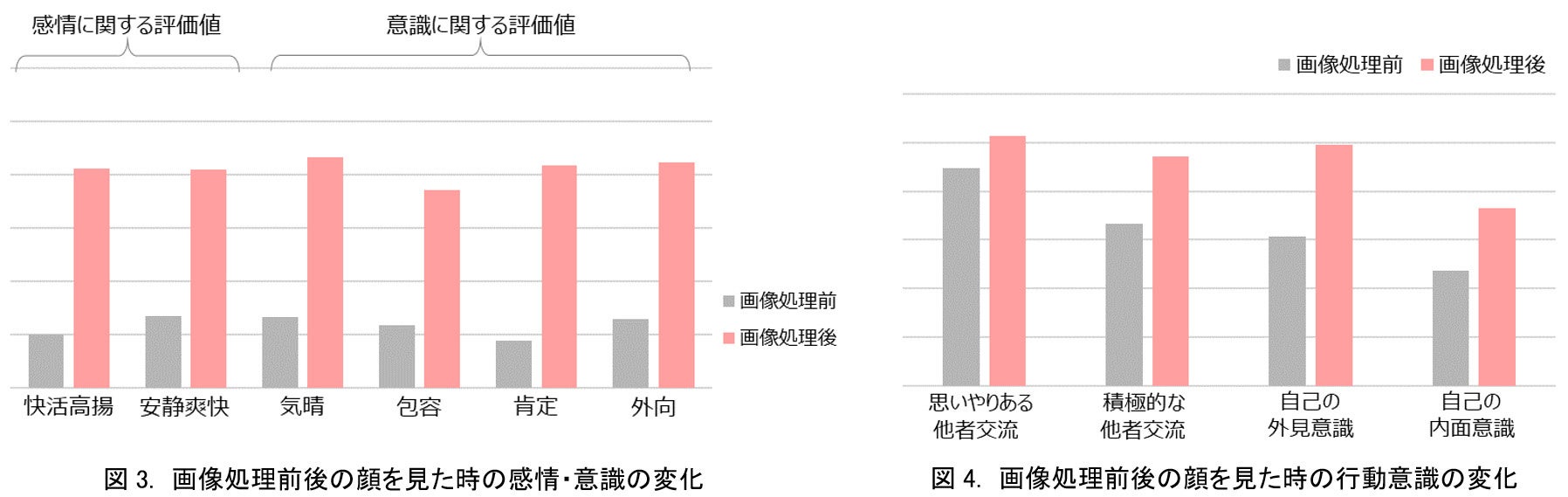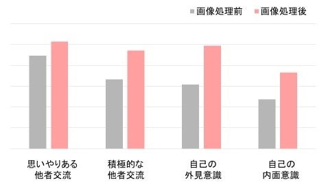 お客さまの肌悩みが解消すると行動意識がどのように変化するか、その検証を行うために、シミを一例として実験を行いました。35-59歳の日本人女性のうち、シミを気にする方でファンデーションでも隠し切れないシミのある方32名を対象に、素肌の顔画像と、素肌からシミを消す画像処理を施した顔画像(図1)を見ていただき、すでに開発済の化粧の感情意識尺度※3 及び今回開発した4つの行動意識尺度の質問紙に回答いただきました。その結果、シミのない画像を見ることで快活高揚等のポジティブな感情が有意に高まり、肯定・外向などの意識が有意に向上することを確認しました(図3)。さらに行動意識は4つの尺度全てが有意に向上することが確認できました(図4)。シミがないことにより「自己の外見意識」が向上するだけではなく、その他の「自己の内面意識」や「積極的な他者交流」も向上するなど、さまざまな行動意識を高めることが確認できました。今回の結果から、肌悩みの解消によりポジティブな感情や行動につながる可能性が考えられました。