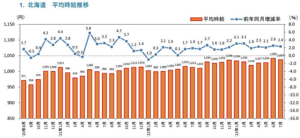 [北海道版]2023年7月度 アルバイト・パート募集時平均時給調査 北海道の7月度平均時給は前年同月より24円増加の1,037円