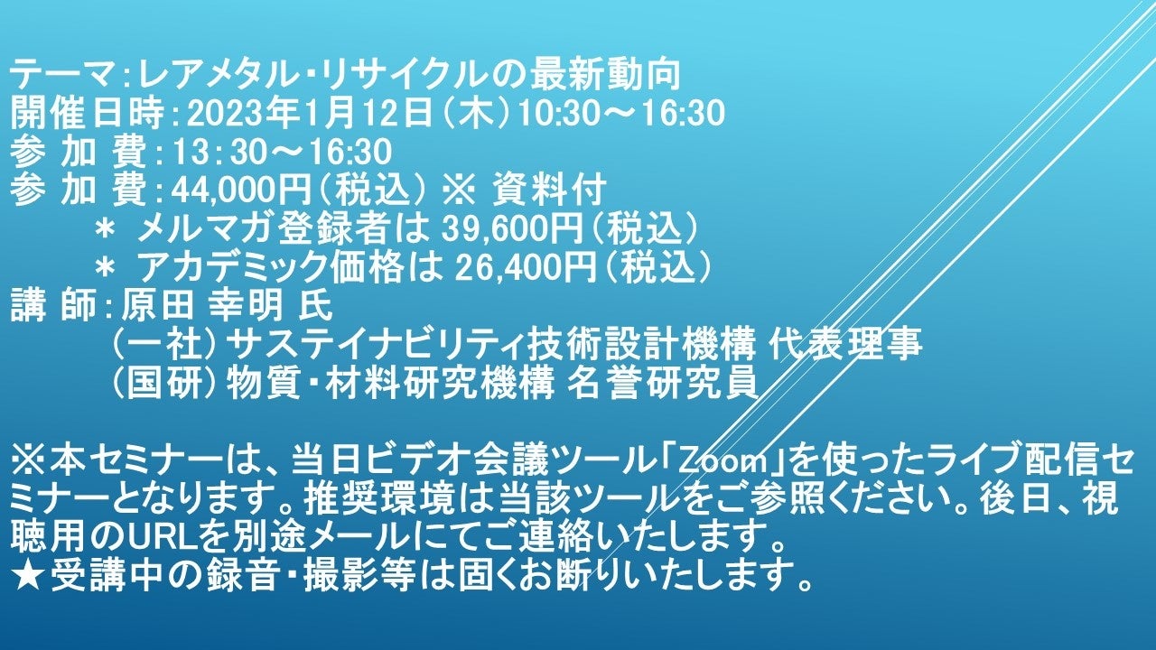 先端技術情報や市場情報を提供している(株)シーエムシー・リサーチ(千代田区神田錦町: https://cmcre.com/ )では、 各種材料・化学品などの市場動向・技術動向のセミナーや書籍発行を行っておりますが、 このたび「レアメタル・リサイクルの最新動向」と題するセミナーを、 講師に原田 幸明 氏 (一社) サステイナビリティ技術設計機構 代表理事 (国研) 物質・材料研究機構 名誉研究員)をお迎えし、2023年1月12日(木)13:30より、 ZOOMを利用したライブ配信で開催いたします。 受講料は、 一般:44,000円(税込)、 弊社メルマガ会員:39,600円(税込)、 アカデミック価格は26,400円(税込)となっております(資料付)。