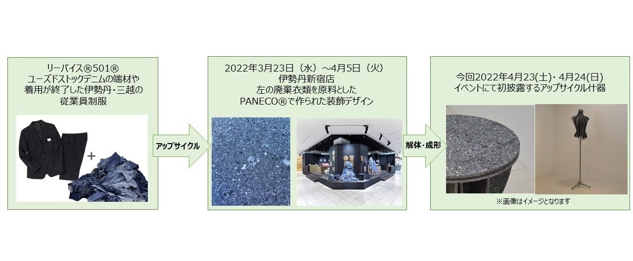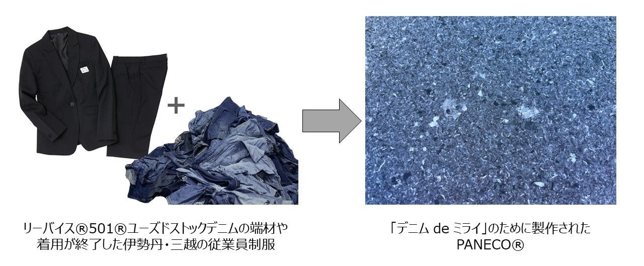 ・今回のパネコ(PANECO®)の素材には、「デニム de ミライ」で使用したデニムの端材約200㎏と、着用が終了した伊勢丹と三越の制服約600㎏を使用。