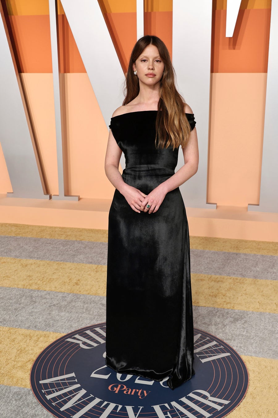 ミア・ゴスは、2024年秋冬オートクチュール コレクションからブラックのクラッシュベルベットのロングドレープボートネックドレスを纏いました。