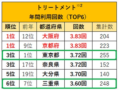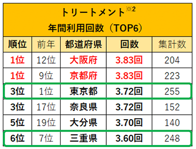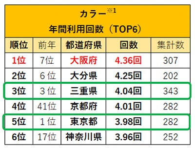 カラーとトリートメントの年間利用回数の1位は、「大阪府」。