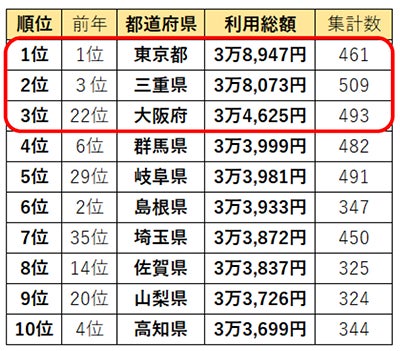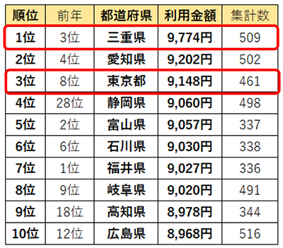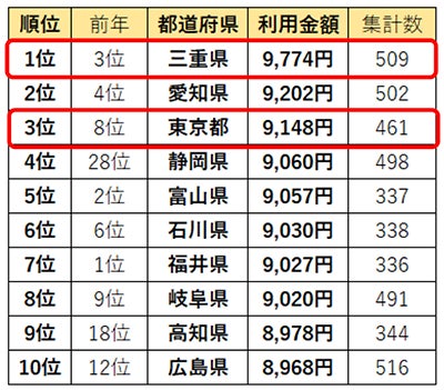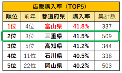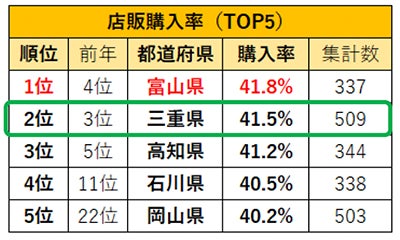 店販購入率の1位は「富山県」。1回あたり利用金額1位の「三重県」は2位にランクイン。