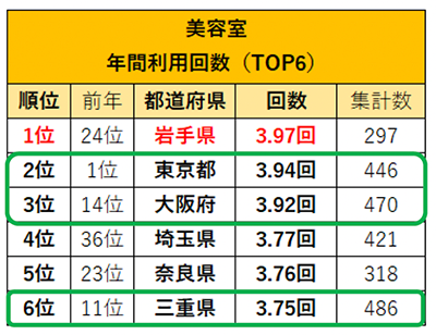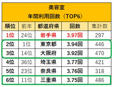 美容室利用回数1位は「岩手県」。「過去1年の利用総額」トップ3の「東京都」「三重県」「大阪府」もランクイン。
