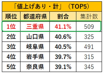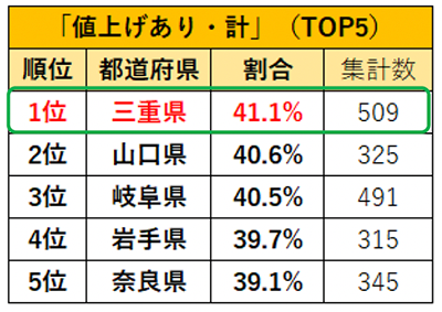 「値上げあり・計」の1位は「三重県」。