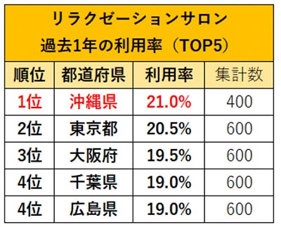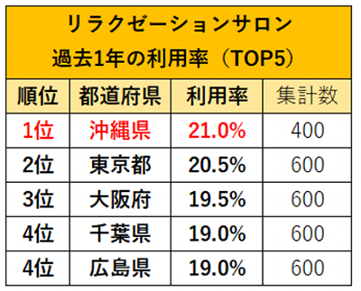 ネイルサロン、エステサロン(脱毛)の利用率は、前年に続き沖縄が1位! 今年から聴取したリラクゼーションサロンも沖縄が1位となりました。沖縄県では、1年を通して平均気温が高く、他の県と比較しても半袖でいる期間が長いことなどから、脱毛への意識が他県よりも高い傾向にあると考えます。