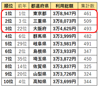 美容室の「過去1年の利用総額」トップ3の「東京都」「三重県」「大阪府」は、サロンへの来店回数が多いことが、利用総額に影響していることが分かります。