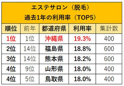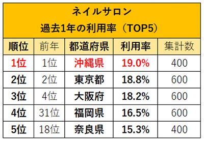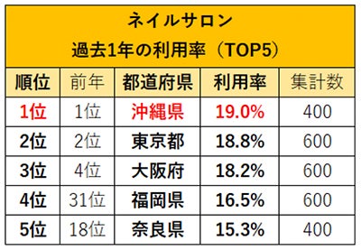 ネイルサロンとエステサロン(脱毛)の利用は、「沖縄県」が2年連続で1位!